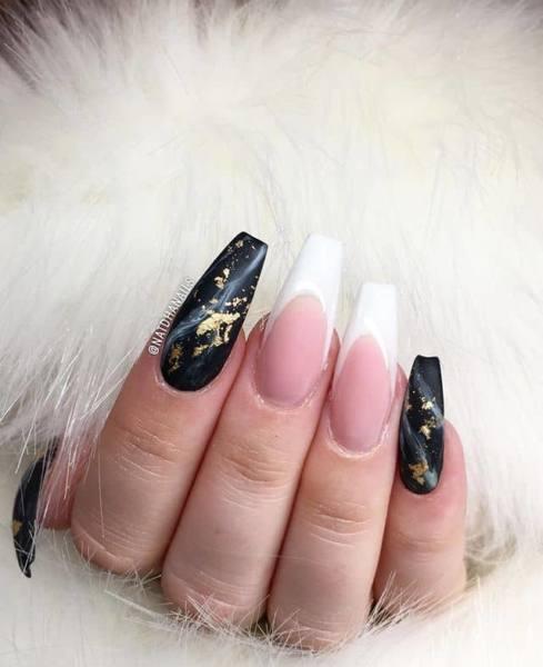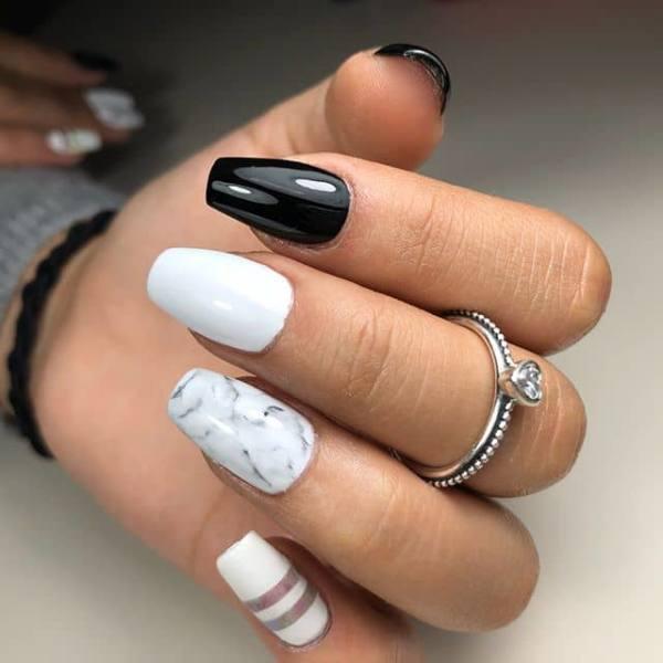 Lo último en nuestra lista de diseños de uñas en blanco y negro son estas uñas geniales y fáciles de diseñar. La primera y cuarta uñas de cada dedo están hechas en un negro brillante y encantador, mientras que la segunda y tercera uñas de cada mano están hechas en un blanco marmolado que parecen algunas de las baldosas de mármol más caras del planeta.