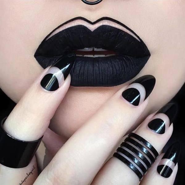 Este diseño es una mezcla de diferentes estilos que de alguna manera trabajan juntos para hacer un diseño cohesivo. La uña del dedo meñique está hecha en un negro brillante y plateado, mientras que el dedo medio está hecho en un negro puro que parece profundo y rico. El dedo anular está pintado en una base negra mate y tiene un arte único de uñas blancas para dibujar el ojo. El dedo índice está hecho en un estilo completamente diferente, mostrando la uña natural y sólo pintando la punta en un negro cubierto de brillo. Suena como si no debiera funcionar, pero lo hace. Es un aspecto único y genial que se ve muy bien para el uso diario normal.