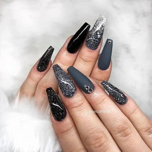 Negro, plata, gris, brillo y piedras preciosas. Estas uñas tienen todo lo que necesitan para ser un poco más grandes, pero no lo son. En su lugar, son la cantidad justa de extra para ser magníficas y con estilo. Las piedras preciosas en las uñas al azar realmente añaden ese toque extra.
