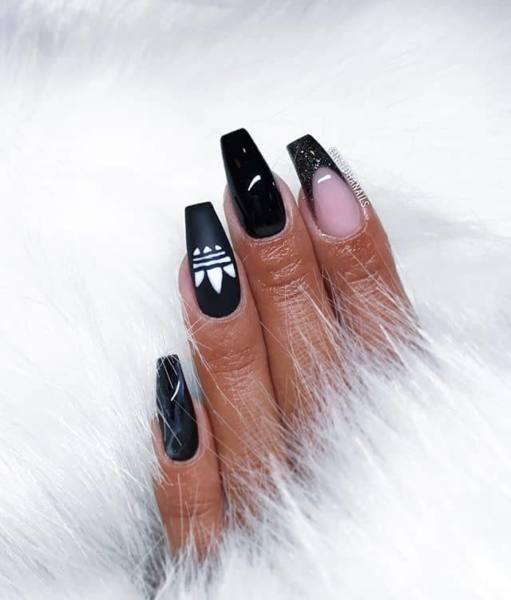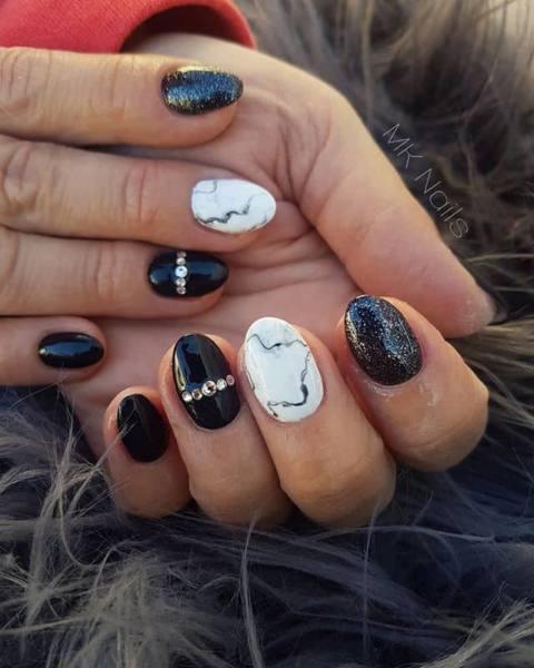 Estas uñas blancas y negras son fáciles de diseñar, pero se ven increíbles. Las uñas del meñique son de un negro intenso y sólido, al igual que las uñas del dedo anular, sólo que tienen una franja de estrás en el medio. Los dedos índices son de color negro brillante, y los dedos medios son de color blanco marmolado, lo que hace que se vea todo el aspecto. Estas uñas son lo suficientemente clásicas para llevar un vestido formal, pero también son bonitas y clásicas para el uso diario.