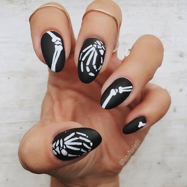 En caso de que no lo hayas notado ya, las uñas funky, con temática de Halloween son algunas de mis favoritas. Este diseño no es una excepción. Estas uñas están pintadas de negro mate, pero tienen estas increíbles manos esqueléticas pintadas en ellas que se ven simplemente increíbles. Se supone que deben verse espeluznantes, por supuesto, con los dedos esqueléticos extendiéndose, pero en realidad, son simplemente apestosamente adorables.
