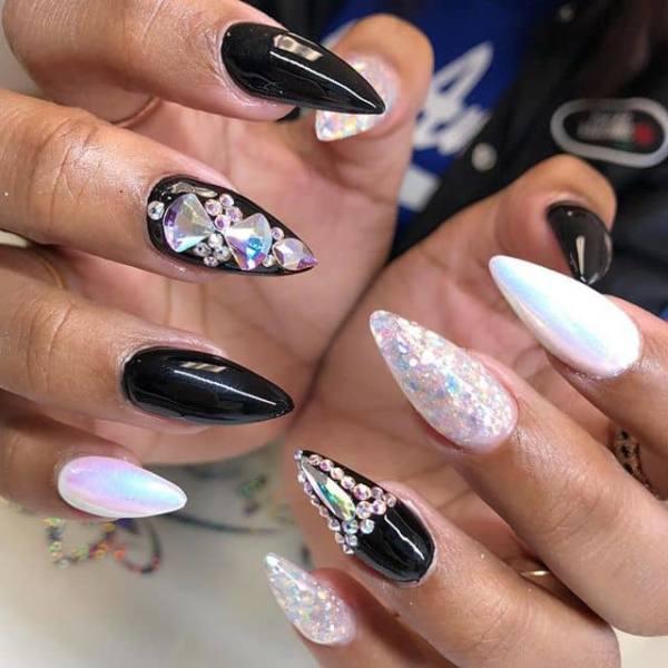 Estos puntas de estilete tienen mucho que hacer, y están destinados a hacer girar cabezas. Alternan entre las uñas negras, las uñas blancas y las uñas cubiertas de brillo blanco. Sin embargo, una uña de cada mano también está cubierta de estrases. Los estrases son de diferentes tamaños y formas, y le dan un nuevo significado a la palabra “brillo”. Son increíblemente geniales y te harán hablar en cualquier fiesta.