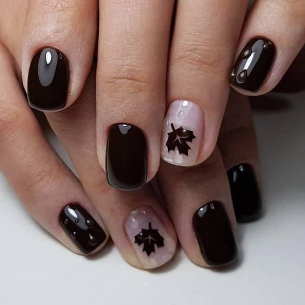 Estas uñas blancas y negras son perfectas para el otoño. Los anillos de cada mano muestran hermosas hojas, y los otros dedos, aunque son simplemente negros, tienen estas manchas increíblemente únicas que parecen gotas de lluvia. Son muy reminiscentes de un día lluvioso de otoño.
