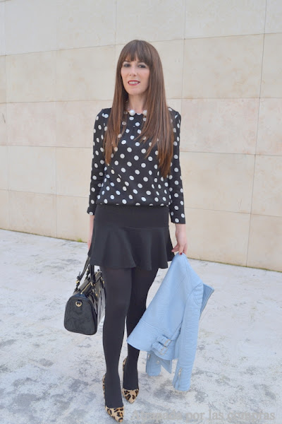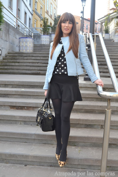 Qué tal las vacaciones de Semana Santa? Las mías estupendas, qué pena que pasen tan rápido..... Hoy os traigo un look de los pocos que me dio tiempo a fotografiar estos días, ya que me dediqué a descansar, disfrutar con los amigos y, sobre todo, desconectar y casi no le dediqué tiempo al blog. En este look combino dos prendas de otras temporadas como son la falda y la blusa de topos, un total look black que rompo con la perfecto azul de Zara, que va a ser, sin lugar a dudas, una de las prendas más vistas de esta primavera. De calzado mis inseparables stilettos animal print de Carolina Herrera, uno de mis bolsos Moschino y el clon del collar de perlas de Chanel. Espero quitar pronto las medias que ya se qué os molestan mucho pero, de momento, me niego a ir pasando frío..... Qué os parece el look?