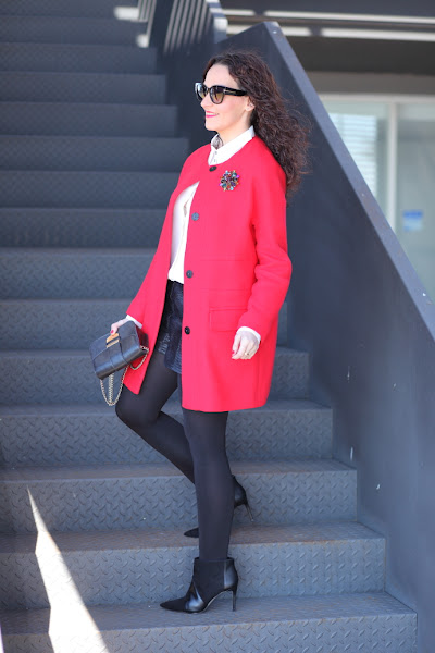 Muchas veces comentáis que os gusta como me queda el rojo a la cara, y os doy la razón, al ser tan blanquita este color me da mucha vida. Por eso mismo hacía bastante tiempo que andaba detrás de una abrigo rojo. Este invierno me probé unos cuantos pero ninguno me convenció lo suficiente como para comprarlo. Sin embargo, hace unos días ojeando la web de Zara vi el que llevo hoy, tal fue el flechazo que a los cinco minutos ya me lo había comprado. Cuando llegó aun me gustó más, el tono de rojo es precioso y los detalles de los botones en negro me chiflan. Además, tiene una tela ideal para llevarlo de cara a la primavera, aunque ahora con una manga larga debajo se puede llevar sin problemas. En mi caso, lo he combinado con una blusa blanca y shorts de piel negros. En los pies mis nuevos botines negros, si os gustan os los recomiendo porque tienen un tacón ideal para llevarlos durante todo el día.