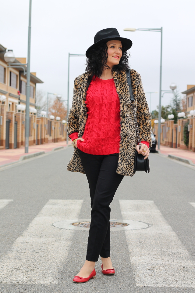 No me gustan nada los días en los que cuando me levanto y miro por la ventana lo único que veo es la niebla. El domingo pasado fue uno de ellos, aunque la niebla se levantó fue imposible llegar a ver el sol. Estos días grises siempre intento utilizar prendas con colores alegres que me animen, como el jersey rojo que me puse para salir a echar el vermut con los amigos. Con el frío que hacía aproveché para estrenar mi nuevo abrigo de pelo con estampado de leopardo, es tan calentito y suave que me chifla ponérmelo.