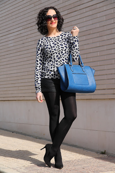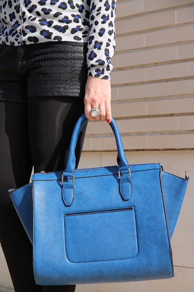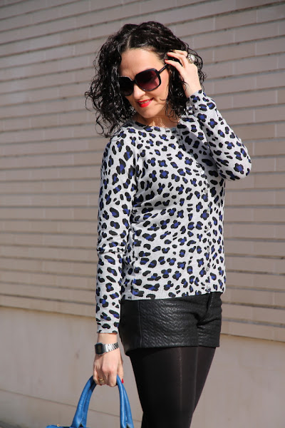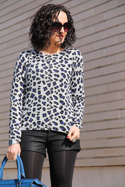 Aunque el gris no me apasiona demasiado cuando vi esta chaqueta que combinaba el gris con el animal print en negro y azul Klein no pude evitar probármela, como ya sabéis el estampado felino me encanta. Como era de imaginar la chaqueta se vino conmigo y la verdad que estoy super contenta con la compra, los looks que resultan con ella cuando la combino con negro me gustan muchísimo como es el caso de hoy con shorts de piel y stilettos negros. Para los complementos he elegido un anillo XXL y mi querido bolso azul Klein.