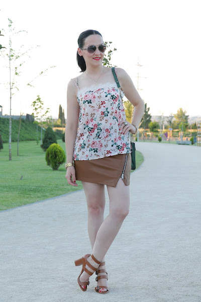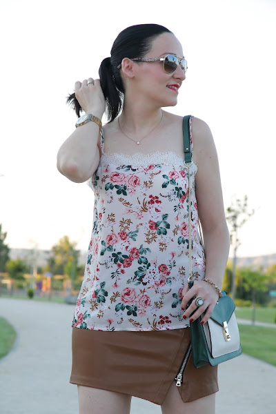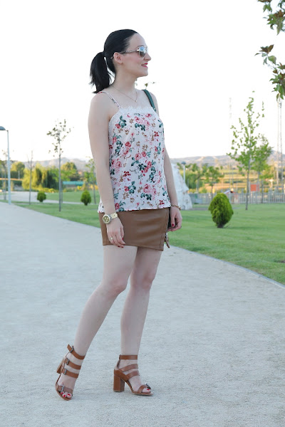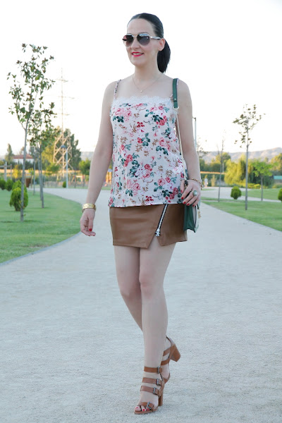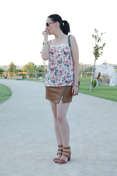 Siempre me ha gustado la ropa confeccionada en piel o polipiel ya sea la prenda entera o combinada con otros materiales. En el blog os he enseñado varios looks con ellas como aquí, aquí o aquí y seguro que seguiré subiendo más outfits ya que sin ir más lejos en Japón me compré otros shorts de piel. En el caso de la falda asimétrica de piel que llevo hoy, la compré en rebajas y me parece preciosa para llevarla en verano con un top de encaje como os la enseño, pero estoy segura de que en invierno con media tupida y jersey de punto quedará genial.