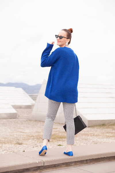 Los tonos azules no suelen llamarme especialmente la atención excepto el azul klein. Este tono siempre me ha gustado por la fuerza que transmite, además, combinado con blanco, negro, fucsia o verde esmeralda es que me chifla como queda. Este día lo llevé combinado con unos pitillos en cuadro vichy blanco y negros y bailarinas de perlas en el mismo tono.