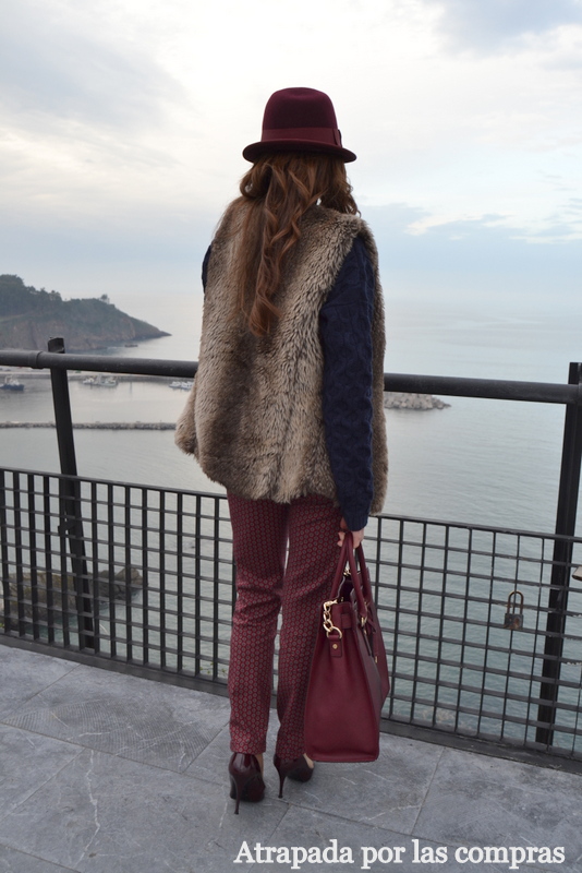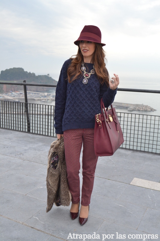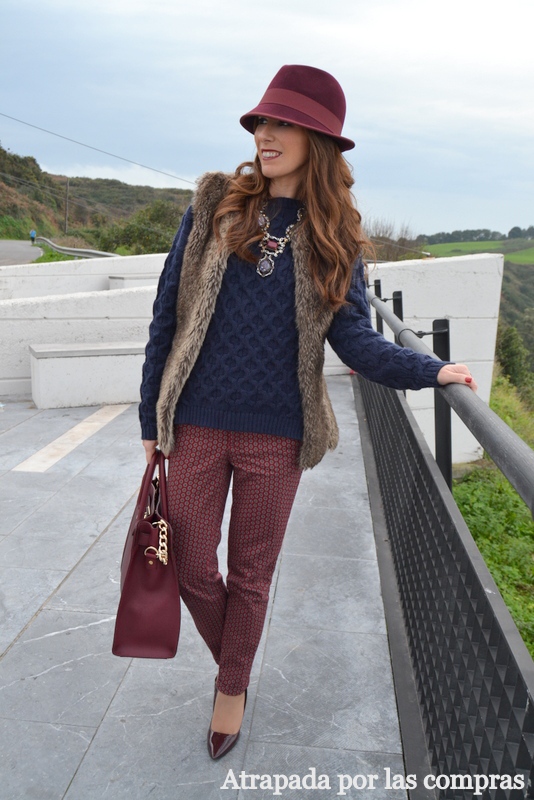 Hay combinaciones de colores que quedan perfectas y desde mi punto de vista una de ellas es el azul marino y el granate. En el look de hoy os enseño esta combinación, por un lado un jersey de ochos oversize azul marino y por otro un pantalón granate tobillero, me estoy aficionando a estos pantalones, para las que son altas con un mocasín y para las más bajitas, como yo, con un zapato de tacón crea el efecto de estilizar la pierna y quedan muy estilosos. Para los complementos escogí el granate como único color, zapatos granates, borsalino granate y bolso granate y de prenda de abrigo, al no estar nada frío, un chaleco de pelo. Qué os parece el look?