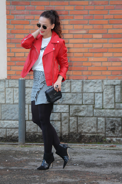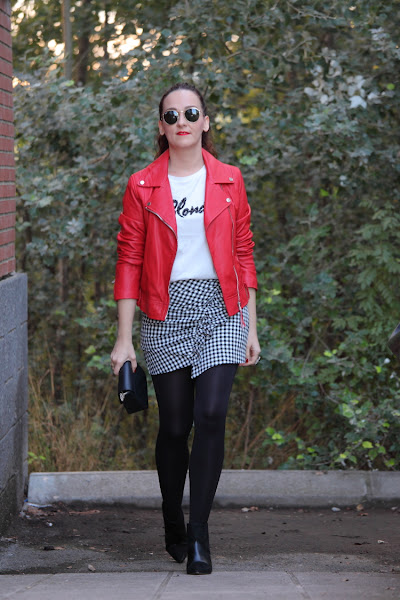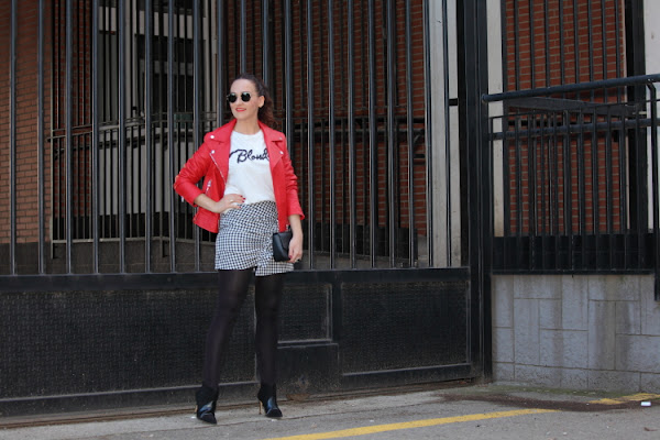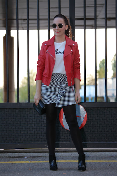Tengo esta falda de cuadro Vichy desde que la sacó Zara a principios de este invierno, pero fue tal el éxito que tuvo que me cansé de verla hasta la saciedad por todas las redes. Así que, aunque me la he puesto bastante, no me apetecía sacarla en el blog para no resultar repetitiva. Sin embargo, hace unos días la llevaba puesta y pensé que la fiebre con ella ya había pasado, y que me apetecía enseñaros este outfit con ella porque me chifla. Por lo que aquí está, un look en el que la combino con una biker roja y camiseta con lentejuelas.