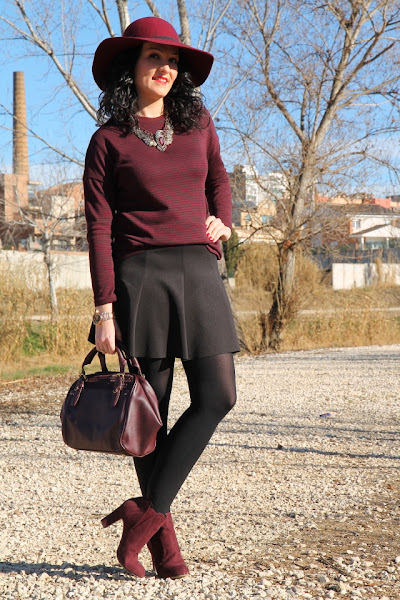 Aunque el sol y yo no somos muy buenos amigos... ¡tengo tantas ganas de primavera que en cuanto veo un rayo de sol voy detrás de él!. Este look es de hace unos domingos, salió un día precioso con un solazo increíble, así que decidí dejar de lado los jerséis y me puse una camiseta de rayas que combina burdeos con negro y falda negra. El resto del outfit lo completé con con fedora, bolso y botines también en granate.