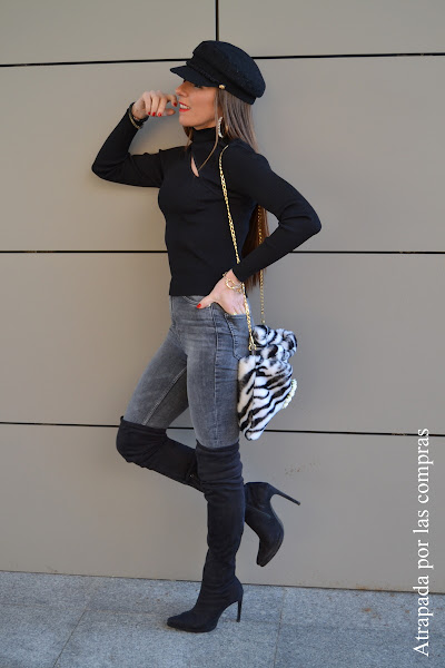 Un look con el que no me puedo sentir más cómoda, perfecto para los días de frío (aún nos quedan unos cuantos por venir.....), combinando prendas básicas pero todas con un toque especial, jeans pitillo grises de cintura alta (estilizan y alargan la pierna), jersey cut out de cuello subido (la abertura delantera y trasera lo convierte en una prenda super sugerente y válida tanto para un look de noche como para un look de trabajo con una blazer encima), botas mosqueteras negras y abrigo de pelo. Como complementos no podía faltar mi inseparable gorra y un furrie bag en animal print y con Frida como protagonista de la firma 22 LOVE STREET. Qué os parece el look?
