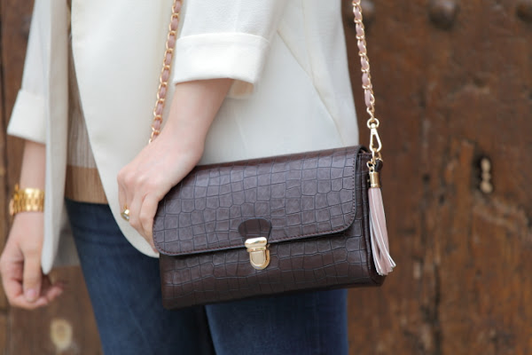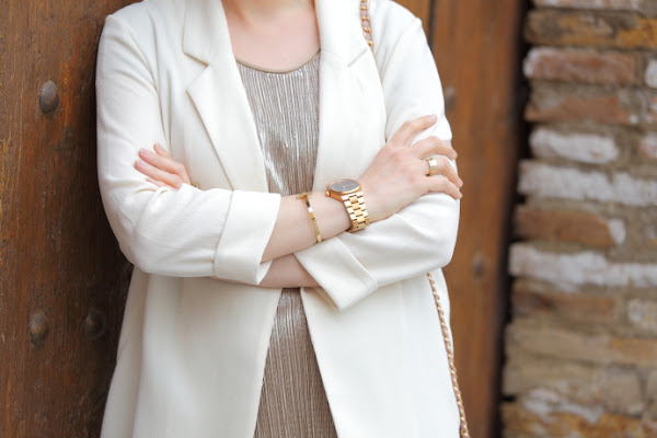 Tengo que dar las gracias a mi chico por las fotos que siempre me hace, porque sin él este blog sería imposible. Pero es que las fotos de hoy me gustan tanto que se me ha hecho realmente difícil hacer la selección. Además, el look que llevo con blazer blanca oversize, camiseta metalizada y pitillos me encanta. Aunque es sencillo como a mi me gustan, gracias a los toques de los pendientes, el metalizado de la camiseta o mi nuevo bolso que me tiene enamorada, le dan un punto que lo eleva a un look trendy chic.