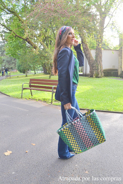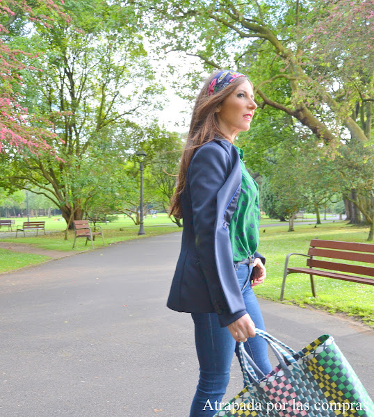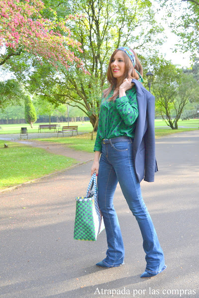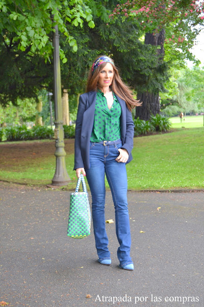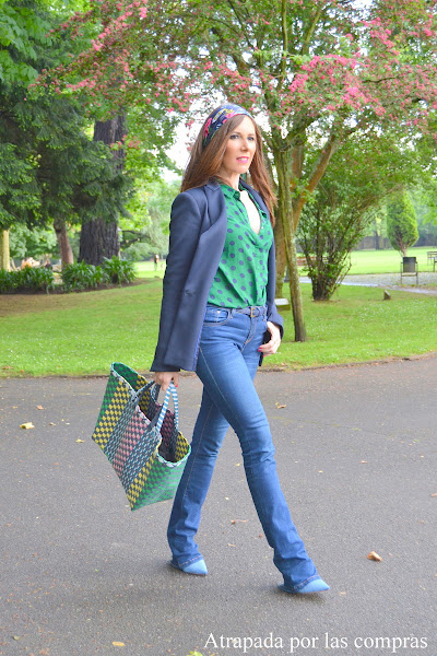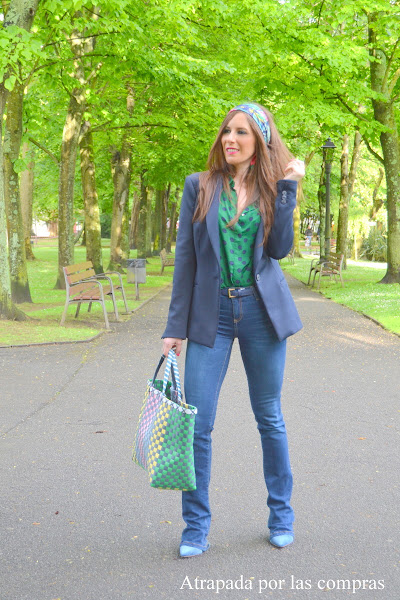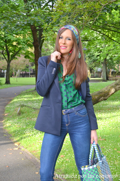 Hoy os enseño un look casual perfecto para el día a día, ir a trabajar, a hacer recados, de compras.... con dos prendas básicas y que no deben faltar en nuestro fondo de armario, una blazer azul marino y unos jeans. Por supuesto no faltan tres de la tendencias de esta primavera 2018, los lunares, con una camisa verde (arcadia, os hablaba de este color en un look de la semana pasada) con lunares azules, un pañuelo de flores (complemento imprescindible esta primavera) que utilicé a modo de diadema y un shopper de plástico trenzado multicolor que fijo que os recuerda a las antiguas cestas de la compra y que esta temporada forman parte de los bolsos más deseados y que más veremos entre las "influencers e it girls". Qué os parece el look?