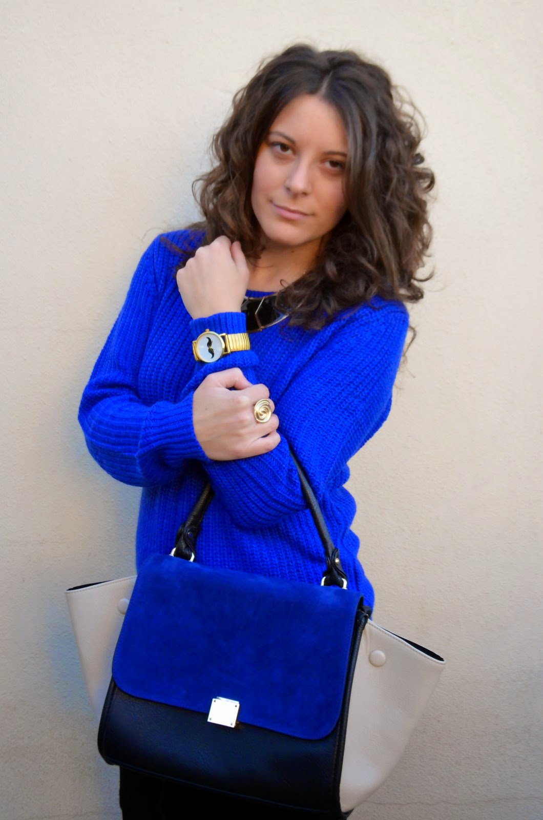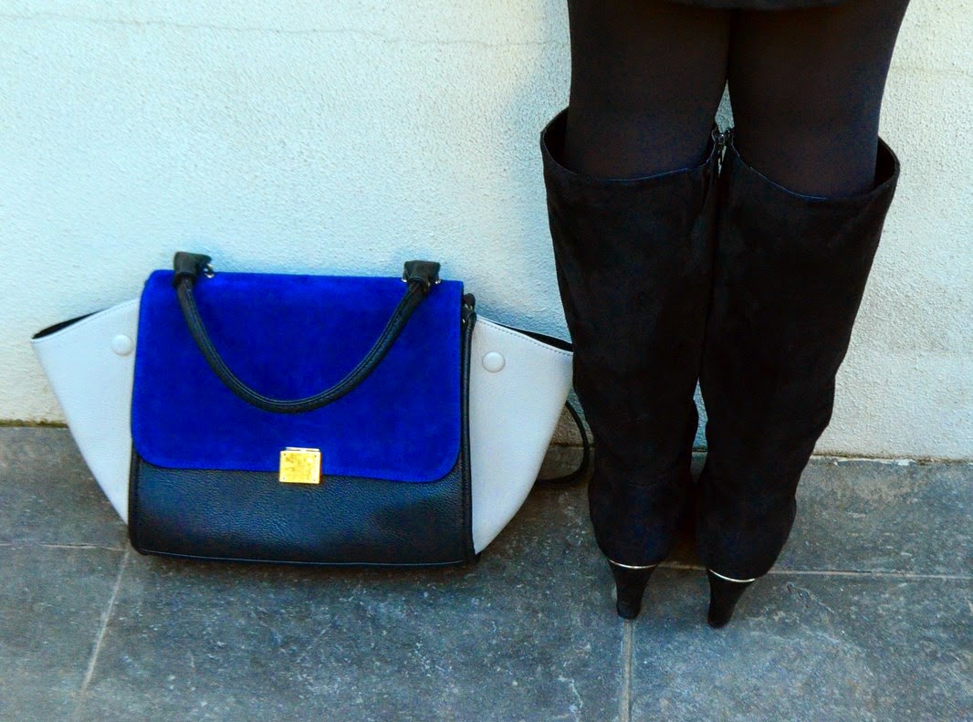 Para estrenar el bolso elegí un look en armonía con los colores del bolso. Una falda de lycra negra, un jersey de lana azul klein y unas maxi botas negras con el ribete dorado en el tacón.