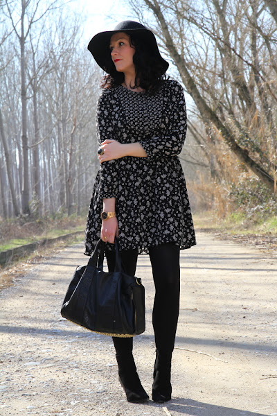 Me encanta llevar vestidos, los estampados florales, el estilo boho y la combinación blanco y negro, así que cuando vi este vestido que lo reúne todo sentí un flechazo. Cuando hace más frío lo acompaño de un cárdigan de punto gordito, pero aprovechando el buen tiempo del miércoles pasado me lo puse tal cual para ir a trabajar. Eso si, aunque el tiempo era bueno el abrigo no andaba muy lejos aunque para las fotos me lo quité.