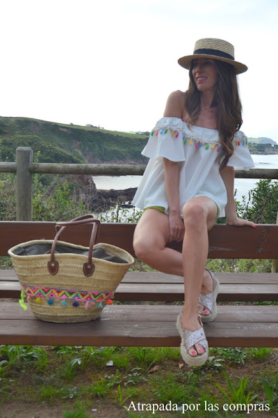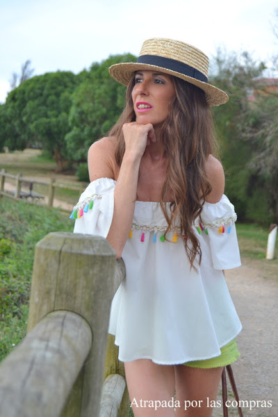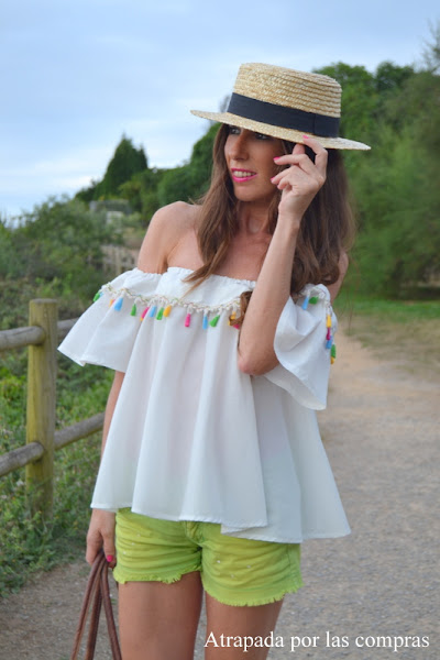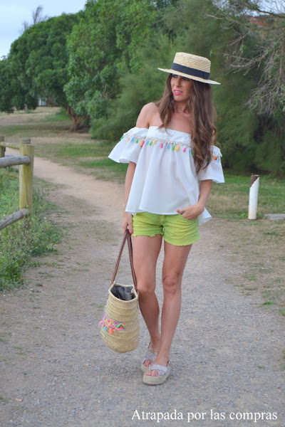 Este verano las borlas y los pompones han inundado todo tipo de prendas, desde vestidos, blusas, tops.....pasando por collares, pulseras, bolsos hasta calzado. Lo cierto que estos detalles tan coloridos dan un toque alegre y distinto a nuestros estilismos. Hoy os enseño un look donde las protagonistas indiscutibles son las borlas. Por un lado, una blusa de ROMWE que fusiona dos tendencias, las borlas de las que os venía hablando y el escote off shoulder o escote bardot del que me he vuelto fan incondicional, y que he combinado con un short del mismo verde que alguna de las borlas y que tengo desde hace un montón de tiempo. Y por otro, un capazo con borlas, un imprescindible en verano que nos sirve tanto para ir a la playa como de bolso shopper. Qué os parece el look?