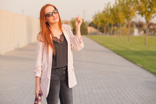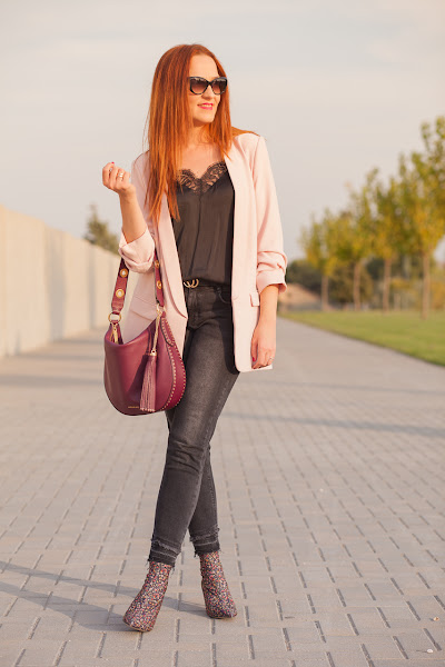 Esta temporada me he vuelto loca comprando botines de calcetín, me resultan tan cómodos que no he podido evitarlo. Ya os los he enseñado en rojo, negro y fucsia, así que hoy tocaban los de flores. Aunque me encantan, al principio dudé si comprármelos porque creía que con ese estampado no me los pondría mucho, pero menos mal que lo hice porque son uno de los que más estoy llevando. Hoy os los muestro con un total look negro con camiseta lencera y jeans al que le sumé una blazer rosa para resaltar el tono de las flores de los botines.