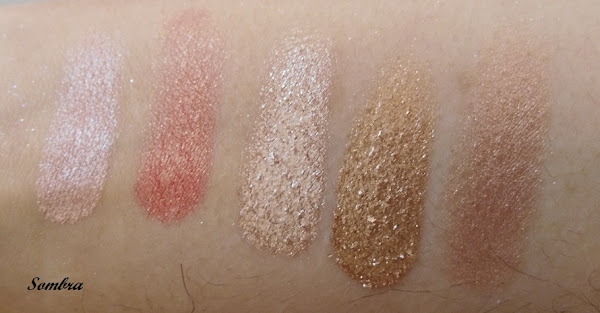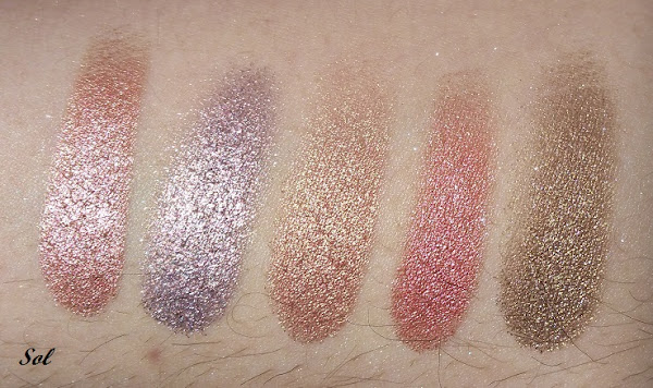 La paleta contiene 15 sombras brillantes que dan la sensación de ser pigmento prensado y que se recomienda aplicar a toques con el dedo. Si las aplicamos con pincel o brocha, nos podemos encontrar con que pierden intensidad y sueltan polvo sobre las mejillas. Son sombras muy brillantes por lo que me parecen ideales para utilizar en ocasiones especiales o para darle un toque diferente a un maquillaje más sencillo. Aún no la he estrenado así que no os puedo dejar ningún look con ella, pero si, los swatches (hechos con el dedo sobre el brazo directamente). Os dejo fotos de las tres filas por orden de arriba a abajo visto a la sombra y al sol.