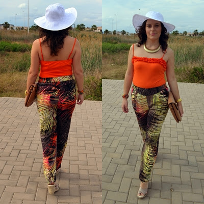 Outfit 10: Pantalones: Festa / Camiseta: Stop Here / Pamela: Primark / Clutch: Tienda local Alicante / Cuñas: Tino González / Collar: Old
