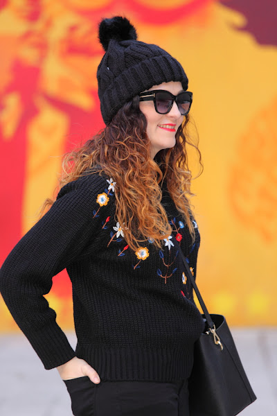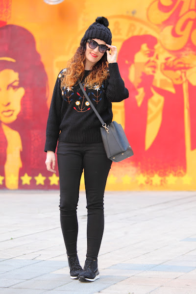 Hace unos días tuvimos que acercarnos a Zaragoza y por casualidad, mientras callejeábamos, descubrimos esta plaza que nos enamoró por el graffiti de una de sus paredes. Aprovechando que llevábamos la cámara encima hicimos fotos a mi outfit. Como veis, iba con un look muy relajado ya que el día se planeaba bastante movido, y que mejor para eso que un jersey de punto gordito con bordado, pantalones y zapatillas molonas.