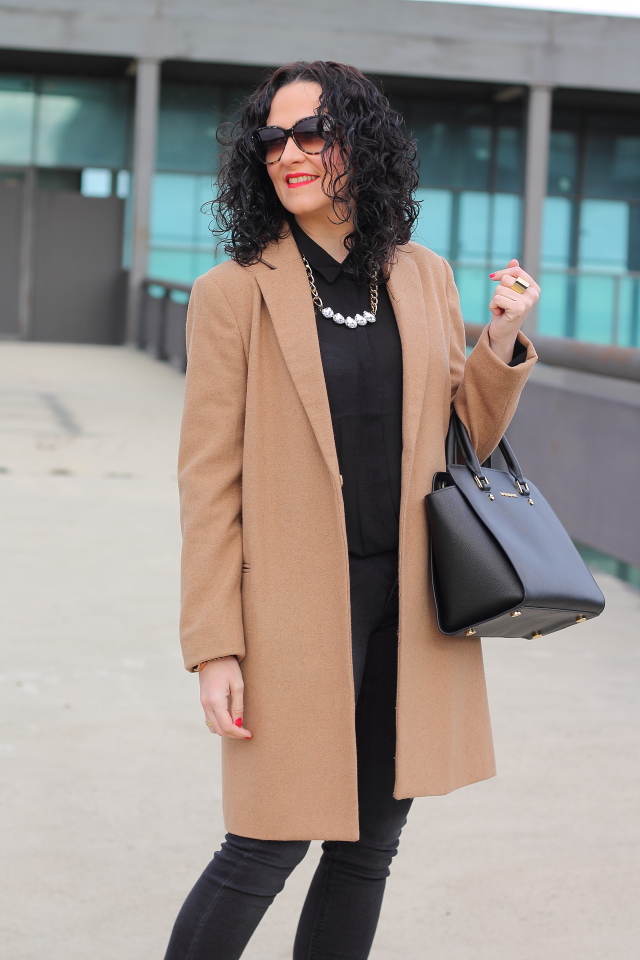 Los que me seguís habitualmente ya sabéis que me caracterizo por llevar looks sencillos y cómodos, donde hago caso a las tendencias en su justa medida y las adapto a mi estilo. Me gusta mucho la moda y me encanta empaparme del street style además, me paso ratos y ratos visitando blogs de moda. Pero aunque los más transgresores me gustan la verdad es que mis favoritos son los que muestran estilismos llevables. Muchas veces veo a chicas con mezclas imposibles que realmente no creo que puedan aplicarse más tarde a nuestra vida cotidiana. Una muestra es el look de hoy, muy sencillo pero a mi me parece perfecto y me encanta. Como siempre he vuelto a confiar en un total look negro haciendo combo con un abrigo cámel y botines marrones. El collar de lagrimas junto con el anillo dorado y el bolso de Michael Kors son los complementos necesarios para darle el toque chic al outfit.