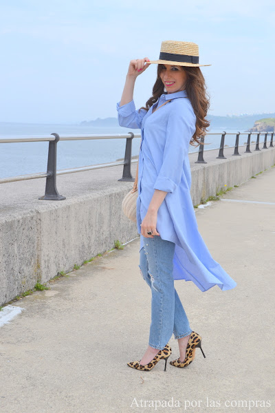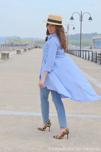 Si en el último post os enseñaba una falda asimétrica hoy le toca el turno a una camisa asimétrica. Una prenda tan básica como la camisa se ha reinventado y ahora la podemos encontrar en multitud de versiones adaptándose, si no a todas, si a casi todas las tendencias. La prueba es la camisa que os enseño en el look de hoy, la camisa azul de corte masculino de siempre pero diferente y reconvertida en una camisa oversize asimétrica. La combiné con otra prenda básica y con lo que mejor queda este tipo de camisas, unos jeans y le decidí dar mas protagonismo a los complementos escogiendo unos zapatos animal print, un sombrero canotier y un bolso bombonera de rafia. Qué os parece el look?