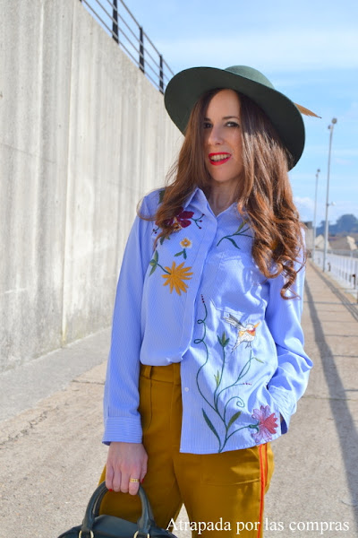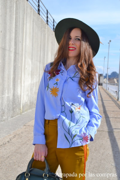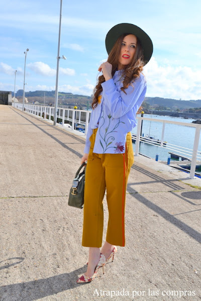 Hoy os enseño un look diferente y quizá un poco arriesgado, si me seguís sabéis que me gusta probar y no encasillarme en un mismo estilo. Un look en el que combino dos prendas de super tendencia este otoño/invierno, por un lado una camisa de rayas verticales bordada, prenda que además promete ser imprescindible la próxima primavera y de la que ya os he enseñado varios modelos combinándolas de diferente forma (podéis volver a verlos aquí: camisa blanca bordada, camisa de rayas bordada y camisa bordada con volantes) y, por otro, un pantalón cropped con banda lateral, un pantalón inspirado en los pantalones deportivos que ahora ha pasado a formar parte de lo que llaman athleisure. la ropa de deporte reinterpretada para nuestros looks diarios. Combiné ambas prendas con unos stilettos de estampado floral y un bolso que anteriormente era gris y debido a un problema que tuve con él decidí teñir de verde y la verdad que no ha quedado nada mal.... El complemento estrella del look, mi nuevo sombrero hecho en exclusiva para mi de LO QUE DIGA RITA, una firma asturiana de tocados, sombreros y diademas que hace cosas tan bonitas y especiales como el sombrero que os enseño hoy, un sombrero que además se sale un poco de los suelo utilizar, porque a pesar de ser muy sombrera, nunca he utilizado este tipo de sombreros de ala rígida y me encanta! Feliz fin de semana!