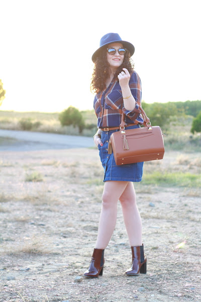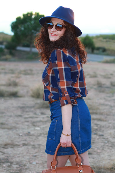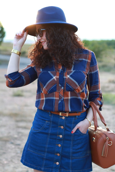 Ya sabéis lo que me gustan las camisas de cuadros y el montón que tengo de ellas. Además, es que es llegar esta época del año y no puedo quitármelas de cabeza. Me encantan para los looks otoñales como el de hoy donde combino una de mis preferidas con una falda tejana abotonada delante. Lo llevo con un sombrero azul, botines de taconazo marrones y bolso también marrón.