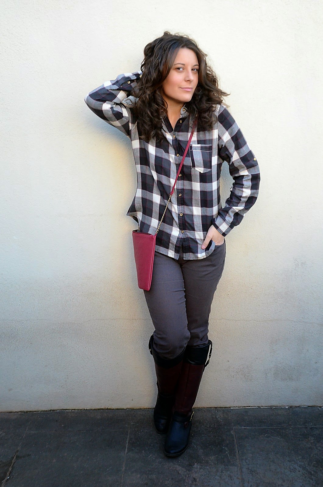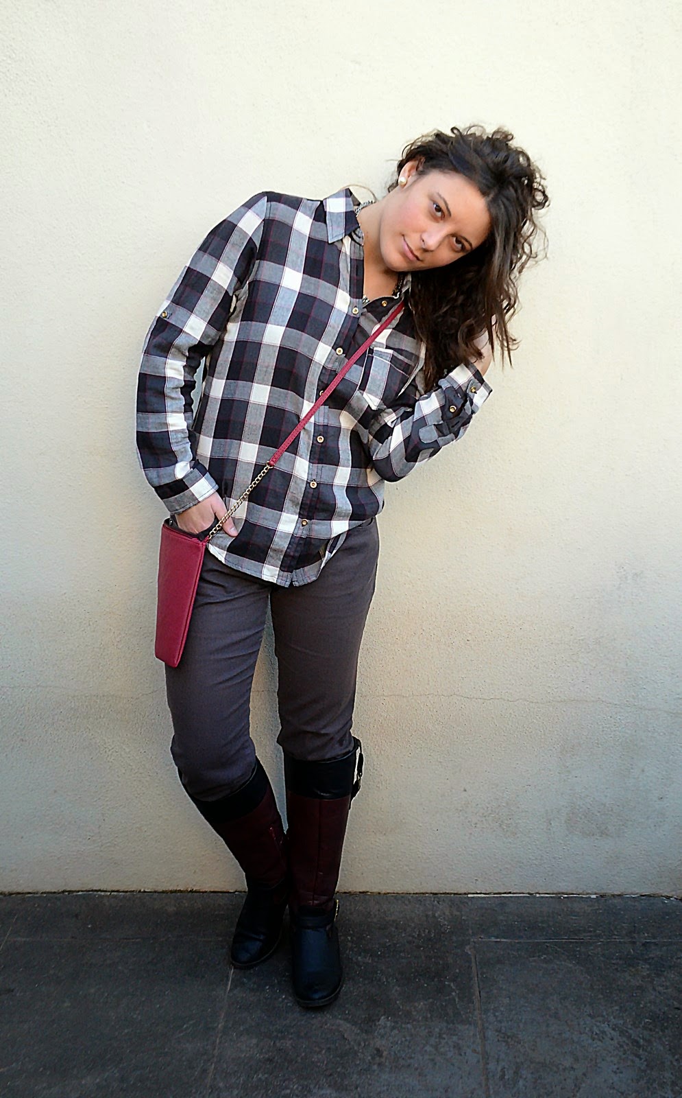 Hoy os muestro un outfit de carácter más desenfadado, y por la gama de colores me voy a permitir decir de rollo "mecánico". Los cuadros de la camisa son de distitas tonalidades de grises y las rayas ddivisoriasen color burdeos. Ya os la mostré en un look más sexy con shorts de cuero, pero esta vez es un look con jeans. ¿Os gustan las camisas tipo leñador?