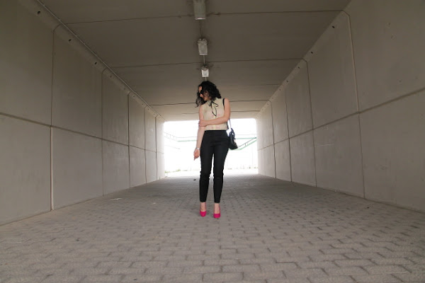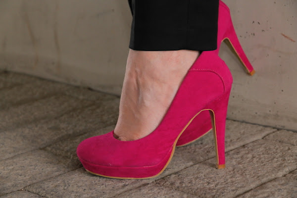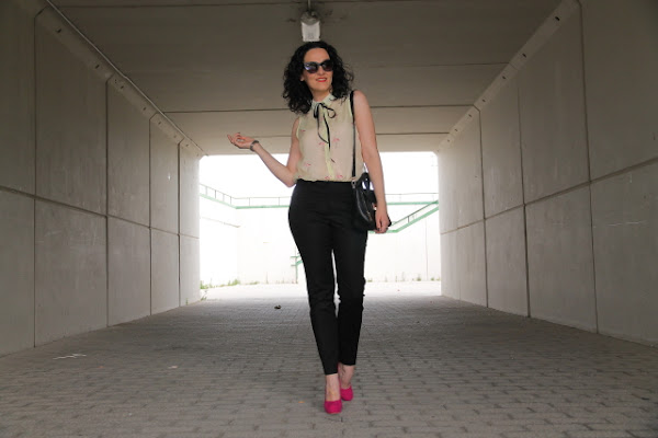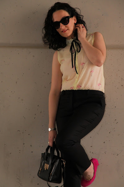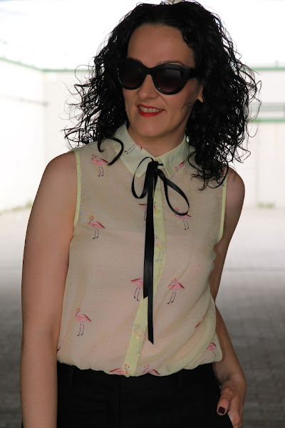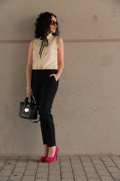 La camisa con print de flamencos que llevo forma parte de una compra online que hice una noche que me aburría y me fui de compras cibernéticas. La verdad es que cuando la vi en la web me gustó mucho pero para sorpresa mía cuando me llegó a casa aun me gustó más. El tono del amarillo y los flamencos rosas no tienen nada que ver con la foto que vi ya que al natural los colores son más dulces por lo que puesta queda más fina. Hoy la ha combinado con pantalones capri negros y le he añadido una cinta negra atada al cuello con una lazada. Haciendo un guiño de color he combinado los pelicanos con mis salones fucsias.