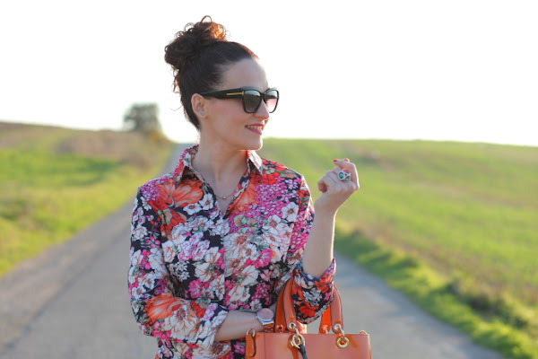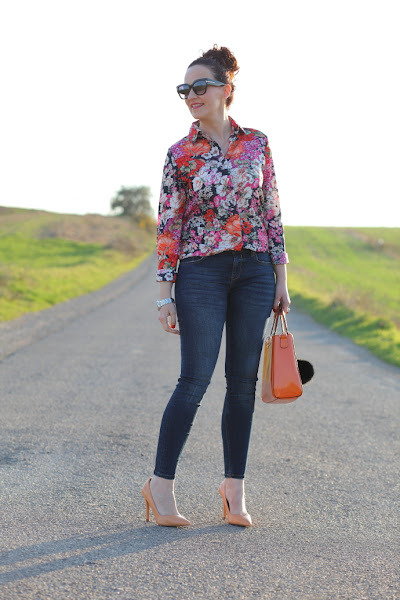 Este invierno los estampados florales con colores vistosos inundaron las tiendas pero en mi caso no me compré nada. Por suerte, este verano van a seguir pegando fuerte y las tiendas siguen estando llenas de ellas, así fue como hace unos días acabé comprando la camisa de flores que os enseño hoy. Tenía claro que al ser una prenda muy vistosa no la iba a llevar mucho y quería algo que no fuera muy caro, por lo que me decanté a comprarla en Newchic. Me encanta el dibujo que tiene, los tonos rosas y anaranjados que combina con un fondo azul marino quedan genial. Decidí estrenarla con mis nuevos jeans tobilleros en azul oscuro y zapatos y bolso en diferentes gamas de naranjas.