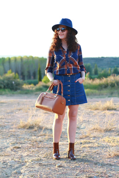 Ya sabéis lo que me gustan las camisas de cuadros y el montón que tengo de ellas. Además, es que es llegar esta época del año y no puedo quitármelas de cabeza. Me encantan para los looks otoñales como el de hoy donde combino una de mis preferidas con una falda tejana abotonada delante. Lo llevo con un sombrero azul, botines de taconazo marrones y bolso también marrón. ¿Os gustan las camisas de cu ...