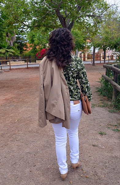 Bueno al lío...Hablemos del look. Como ya sabéis que me encantan las blazers, cuando hace un poco de fresquito como la semana pasada, opto por llevarme una siempre encima. Combiné unos ripped jeans blancos con una camisa de camuflaje que me compré en Amichi esta primavera. Para continuar en colores tierra y del estilo del camuflaje opté por unos peep toes y un bolso en tonos marrones suaves.