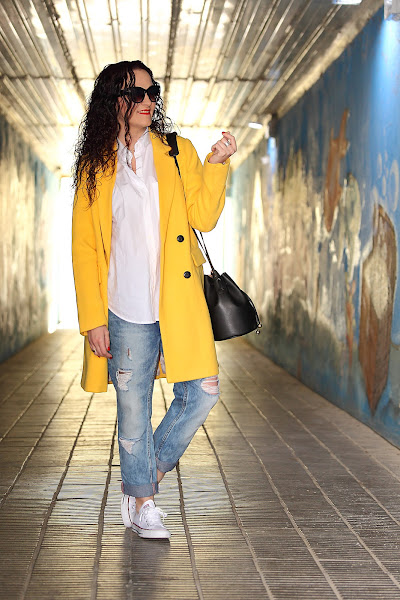 Hace unos días os mostré este abrigo amarillo combinado con un total look negro, hoy en cambio os lo enseño con un look casual mucho más relajado. Lo llevo con mi nueva camisa oversize, jeans boyfriend y Converse blancas. Además, le he añadido mi nuevo bolso bombonera que me chifla por el tamaño y su forma tan redondita.