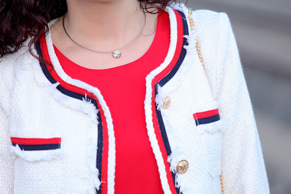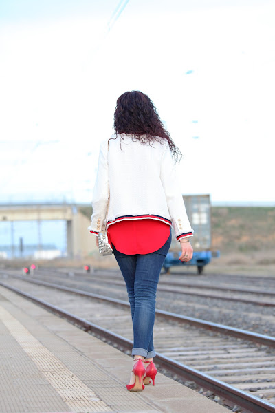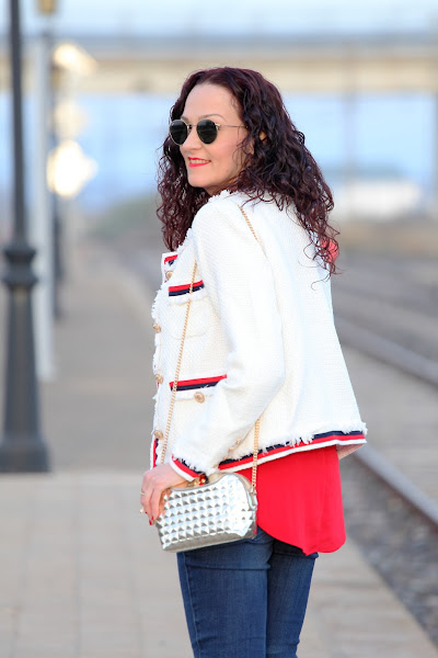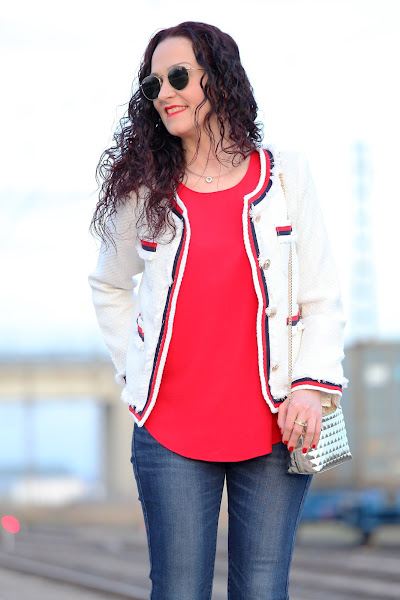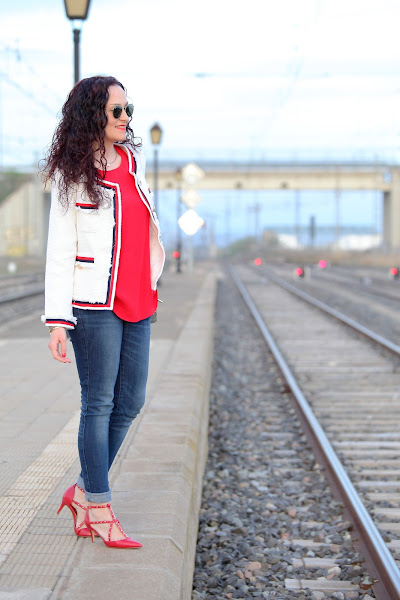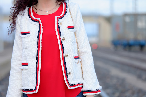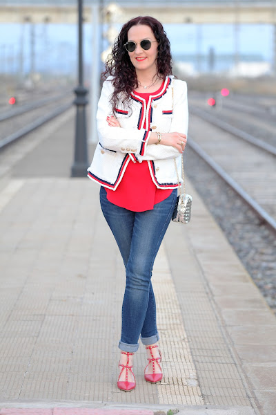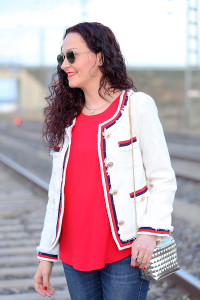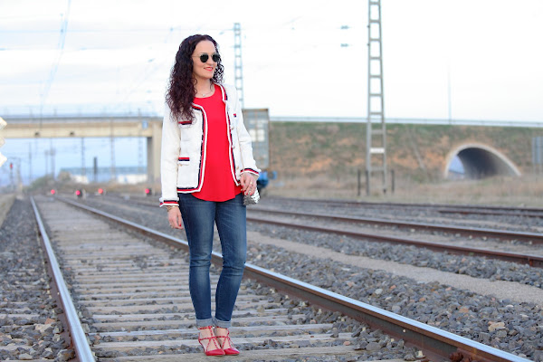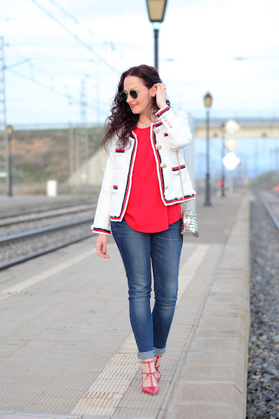 Las chaquetas de tweed estilo Chanel siempre son un básico en mi armario, me gustan y lo mejor de ellas es que durante la primavera y el otoño son ideales para llevarlas con un top más liviano debajo. La que os enseño hoy es mi última compra, me enamoró al ser blanca con el ribeteado en rojo y azul marino, y como veis, aprovechando el buen tiempo de la semana pasada no esperé para estrenarla.