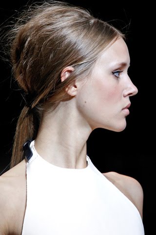 Tenemos una coleta baja muy desenfadada y con volumen es la parte de atras con un crepado sin forma, que es lo que le da el aire tan sofisticado.