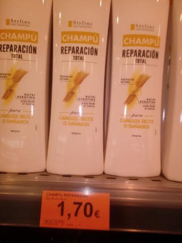 En primer lugar, utilizo un champú para cabellos secos o dañados de la línea Stylius de Mercadona Reparación Total. Y el precio es 1,70€.