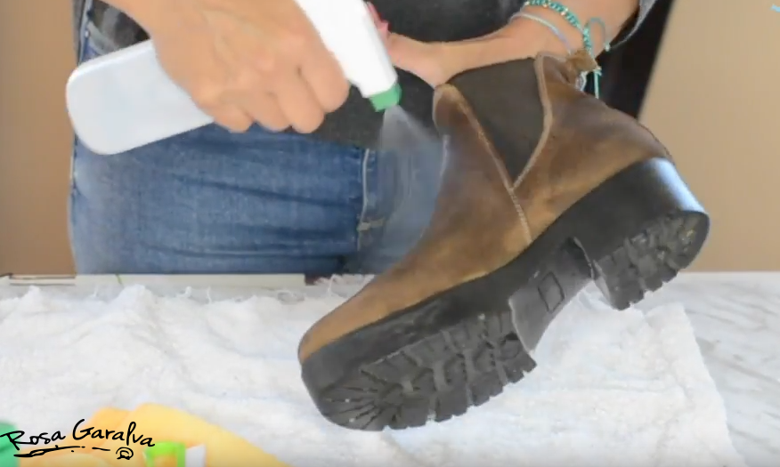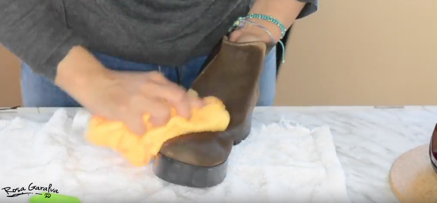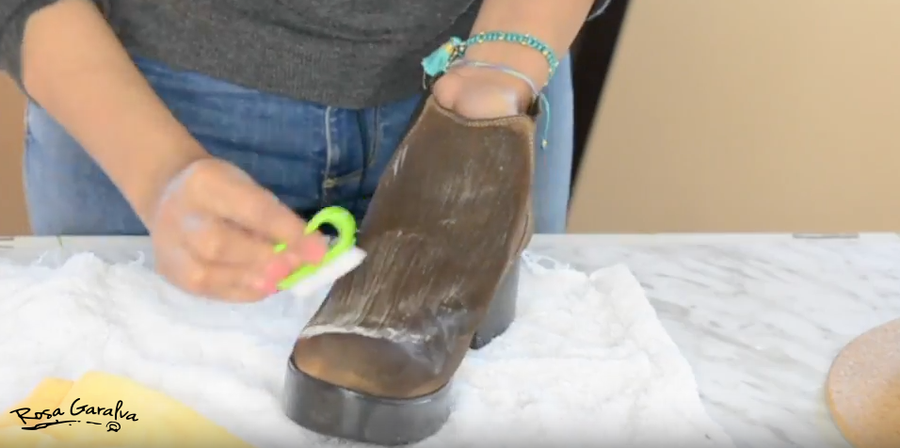 Moja un cepillo de cerdas suaves en la mezcla de shampoo y agua oxigenada y con éste frotas la bota.
