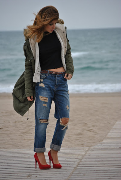 But if I learned something working in a clothing store is that a garment can really change if you wear the right accessories. So, what I want to say is that I realized that the right way to wear this jeans for me (I am petite, so this kind of oversized clothing does not look very good on me) was putting on some heels and a fitted top. So that was what I did: Boyfriend jeans, a fitted black top and red heels for adding a touch of color to the outfit. To fight the cold weather, ecru cardigan and oversized green parka.