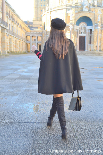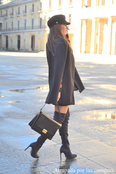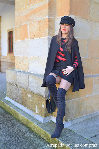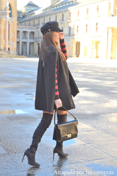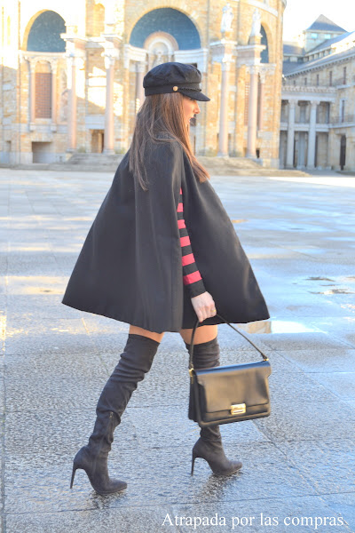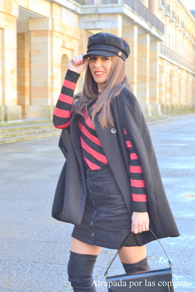 Seguimos con las capas pero hoy con un look distinto al anterior. Un look con cierto aire francés con una capa muy sencilla en color negro que tenía olvidada y que ya os enseñé hace tiempo en otro look, un jersey de rayas rojas y negras y una falda de corte A y botones delanteros. El toque más chic y especial del look lo aporto con los complementos, unas botas mosqueteras, un bolso vintage y uno de los indispensables este otoño/invierno, una gorra marinera, gorra de capitán o gorra bakerboy Qué os parece el look?