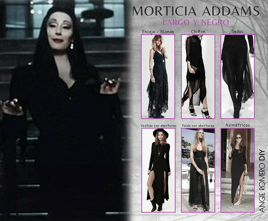 Morticia Addams ¡Preciosisima! Es un personaje viejísimo de historietas y me encanta la versión de Anjelica Huston. En Morticia domina el negro, prendas largas y ajustadas con un estilo gotico, elegante y recatado. Si no quieres verte disfrazada como Morticia pero quieres imitarla les propongo camisetas o vestidos cortos con manga campana o armar layering con otras prendas semitransparentes. “LAYERING es sobre poner prendas, armas capas de prendas”