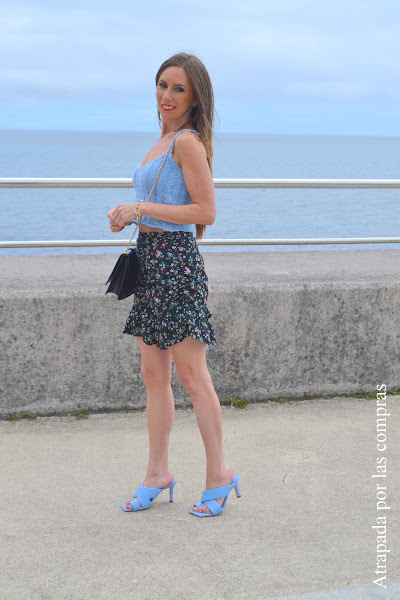 El crochet es una de las tendencias del verano, lo más habitual es verlo en tops. Hoy precisamente os enseño un look con un top de crochet azul cielo que combino con una minifalda de flores. De calzado unas sandalias azul cielo.