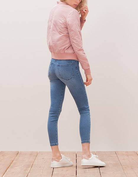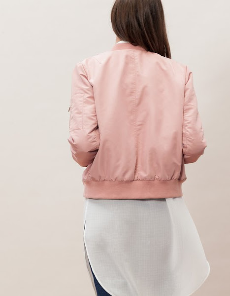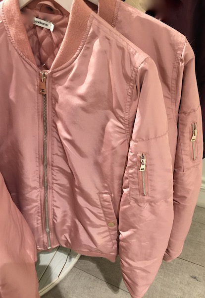 Stradivarius es la tienda que tengo fichada, de las baratitas, donde han hecho copia de la primera bomber rosa que se lució esta temporada, probablemente en Moschino o Tommy Hilfinguer.