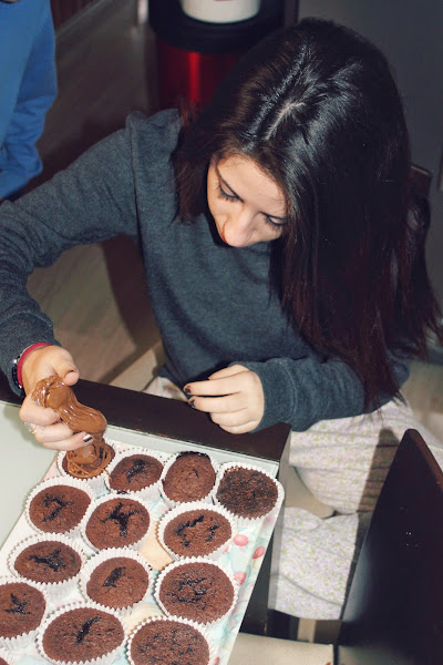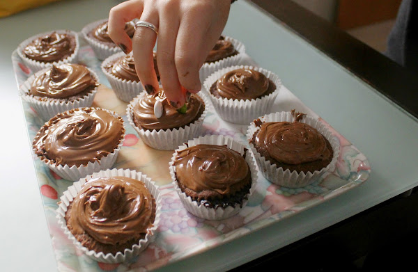 Ahora toca decorarlos!! Bueno, como a mi esto no se me da nada bien, decidí simplemente echarle crema de cacao por encima, pero si a ti te gusta más esto puedes hacer el frosting que normalmente se hace para los cupcakes