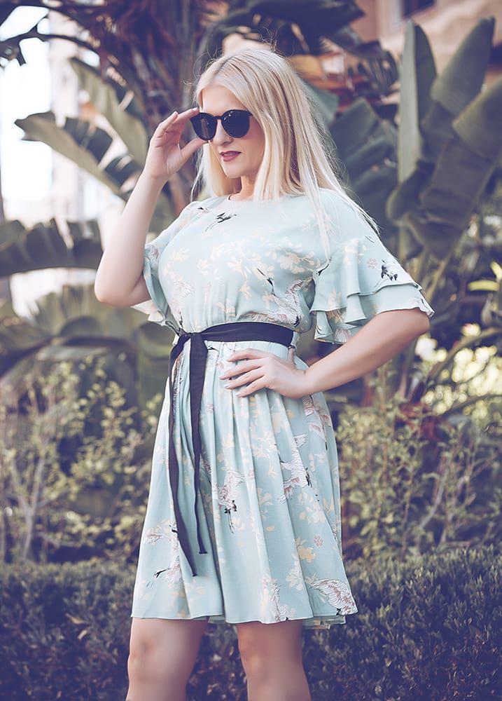 Pero está claro que mi amor por lo japonés siempre me mantiene en alerta, y entre las perchas de ZARA encontré un vestido inspirado en los kimonos, pero con un toque muy trend. Un vestido que une la tendencia volantes con la delicadeza del kimono; las mangas de corte japonés con volantes quedan preciosas y el lazo anudado a la cintura es el punto cool japonés, me encanta. Mirad que estampado, con la majestuosa grulla y las delicadas flores de los magníficos jardines japoneses, de verdad que me tiene enamorada. El vestido tiene una bonita abertura en la espalda, es ideal.