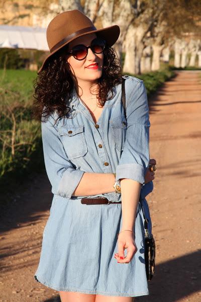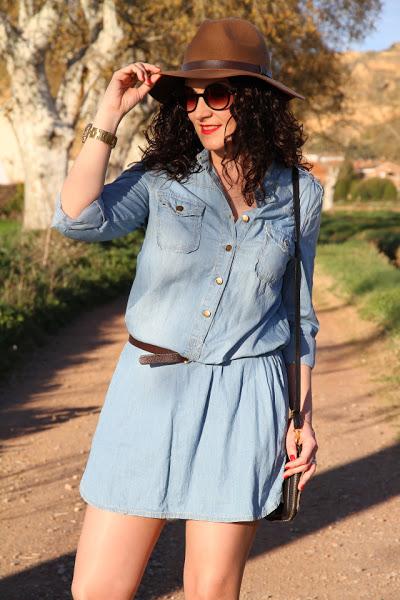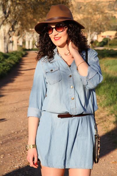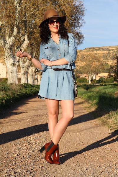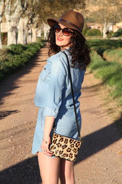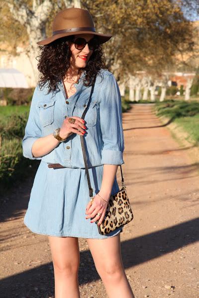 Esta temporada estoy disfrutando muchísimo de las tendencias porque las veo muy yo, muy de mi estilo. Tanto es que varias prendas que llevé años atrás ahora se vuelven a llevar igualitas y yo encantada porque algunas de ellas me daba penita tirarlas y las he estado guardando hasta la fecha. Este vestido tejano es una de ellas, lo compré hace varias temporadas y ahora lo tenemos idéntico en las tiendas. Así que no he perdido el tiempo y me lo he puesto con sombrero y botines marrones y bolso cruzado con estampado de leopardo que siempre hace buen combo con el tejido denim.