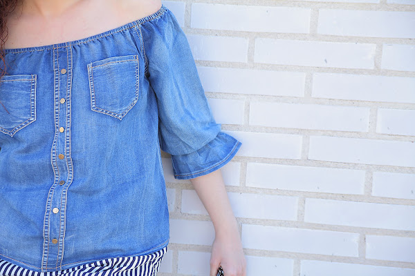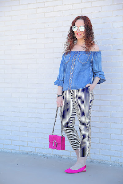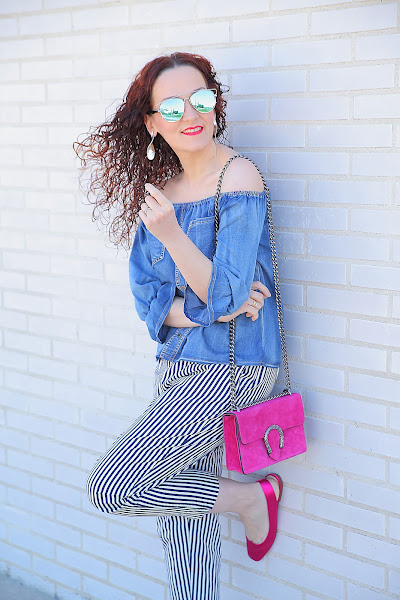 Como se nota que ha llegado el calorcito y tanto los colores vibrantes como los estampados propios del verano ya han aparecido. Hoy llevo un top tejano con escote enseñando los hombros que he combinado con unos pantalones de rayas que me encantan y que van a ser unos de mis favoritos este verano. Para darle luz al outfit, le he añadido los complementos en fucsia tanto en los zapatos como en el bolso. También llevo mi nuevo anillo de Soufeel, tan sencillo pero tan bonito y original a su vez. Además os recuerdo que tenéis un 10% de descuento en todas las compras que hagáis en Soufeel introduciendo el código SHS10