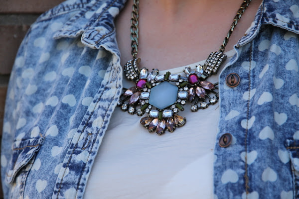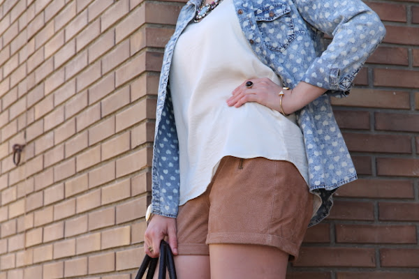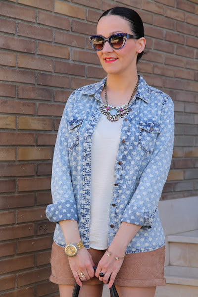 Muchas veces nos rompemos la cabeza pensando que ponernos y no pensamos que a veces los mejores looks son los más sencillos. El look de hoy es uno de ellos, un combo formado por una camisa tejana con print de corazones, top crudo y shorts de piel camel. Un estilismo compuesto por prendas que prácticamente todo el mundo tenemos en nuestro armario y que juntas con los complementos adecuados como el collar joya que llevo quedan realmente bien.